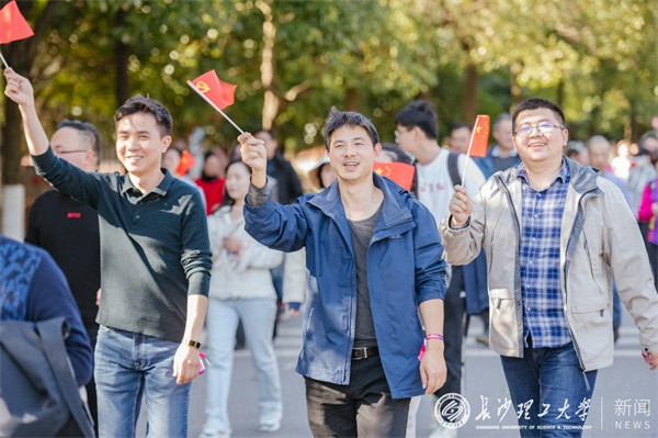 在活动过程中,参赛选手们高举党旗和国旗,昂首阔步,你追我赶,每个人脸上都洋溢着幸福的笑容,整个校园都充盈着运动的气息和昂扬的斗志。教职工们走下讲台、走出办公室、走向运动场,用行走驱赶压力,用行走拥抱阳光,用行走奔向新时代。