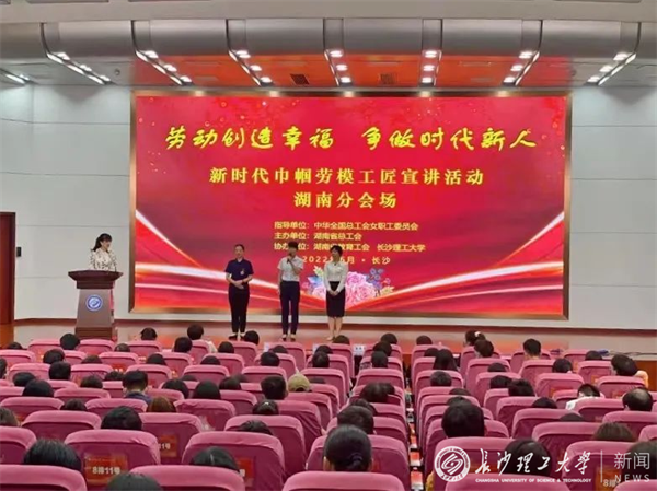6月28日上午,“新时代巾帼劳模工匠宣讲活动”在威廉体育云塘校区图书馆报告厅举行。活动由全总女职工委员会指导,湖南省总工会主办,湖南省教育工会和威廉体育williamhill共同协办。湖南省总工会副主席、党组成员、女工委主任傅筝,湖南省教育工会副主席王常华,威廉体育williamhill党委委员、副校长、工会主席蒋璟萍,湖南省总工会女职工部部长尹素云,湖南省教育工会女工委主任孙晓红,学校师生代表共计300余人参加本次活动。威廉体育工会常务副主席郭剑主持活动。