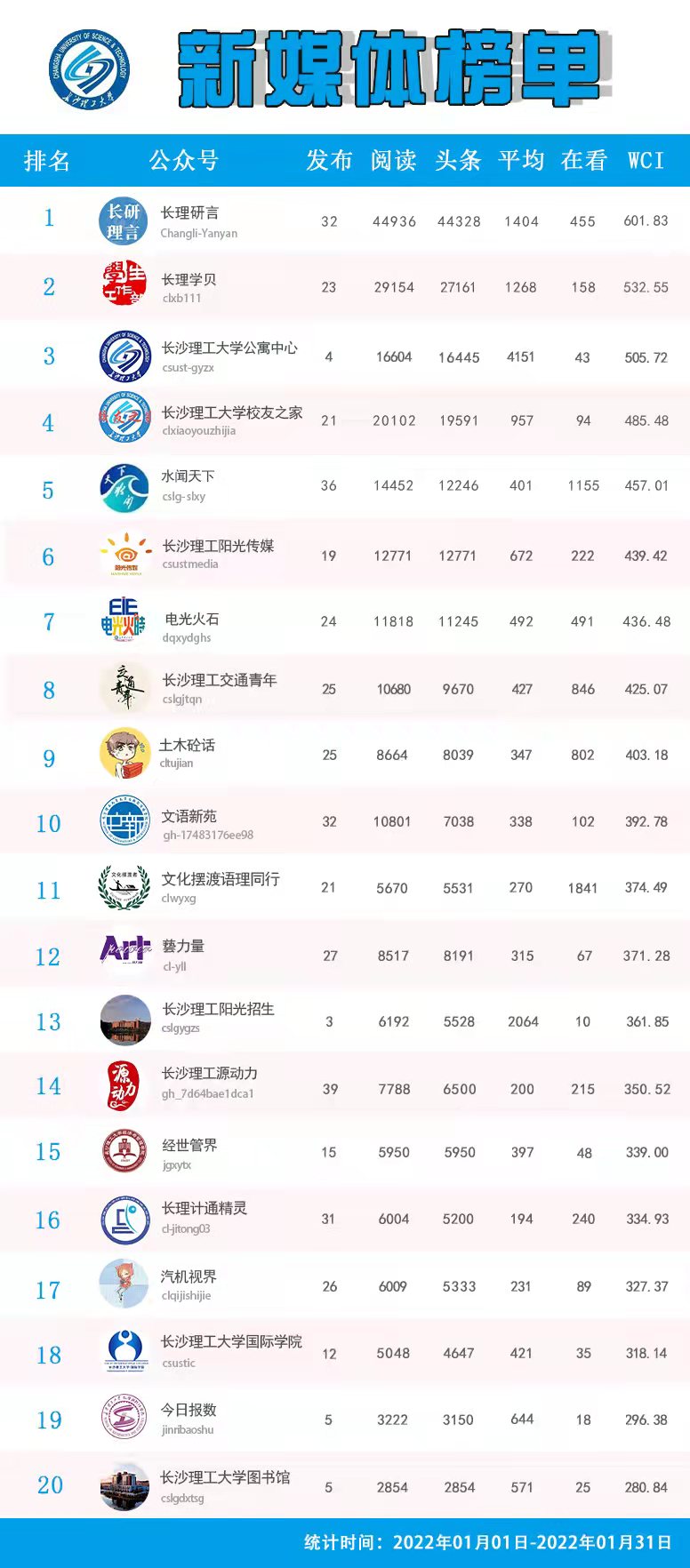 校属单位微信公众号排名(2022年1月)