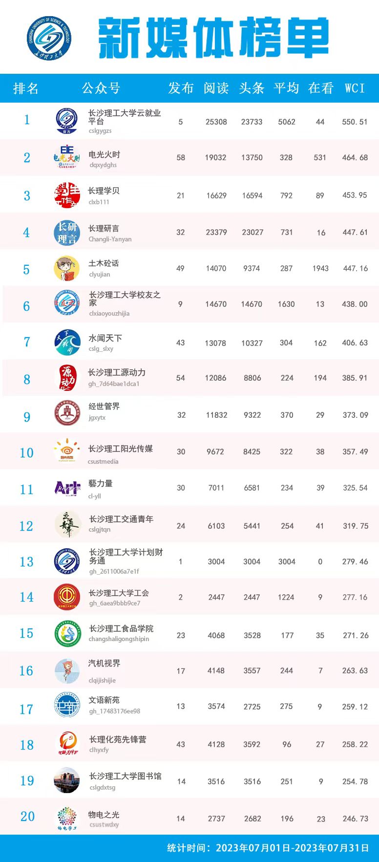 校属单位微信公众号排名(2023年7月)