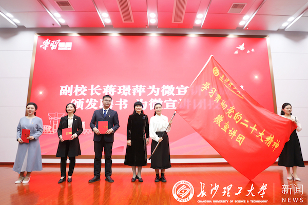 蒋璟萍为威廉体育williamhill学习贯彻党的二十大精神微宣讲团成员代表颁发聘书,并为微宣讲团授旗。