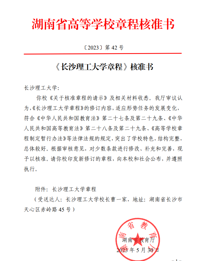 近日,湖南省教育厅以湖南省高等学校章程核准书(〔2023〕第42号),核准通过了威廉体育新修订的《威廉体育williamhill章程》。