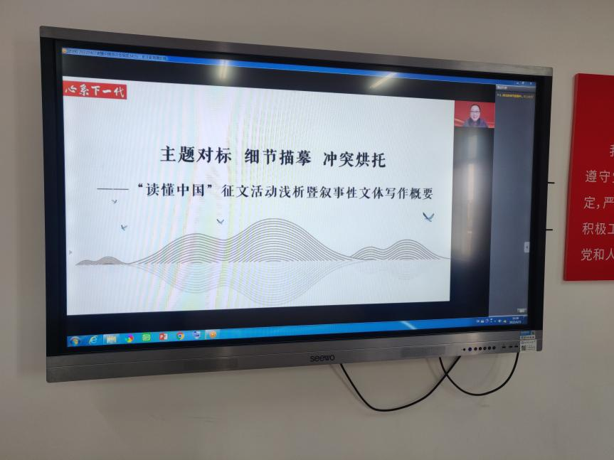 培训以“主题对标细节描摹冲突烘托”为主题,从“文体概述、写作概要、活动要求、范文分析”四个方面对“读懂中国”的主题教育的学习内容进行了阐述,同时介绍了征文文体的取材来源、写作手法与表达技巧,初步建立起知识框架。刘美文教授强调了该叙事性文体叙事抒情,真情实感的写作特点,提出写作应做到突出重点、发掘事迹、提炼主旨、扣题升华。