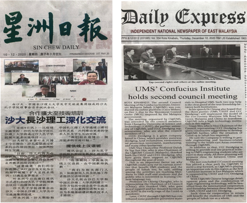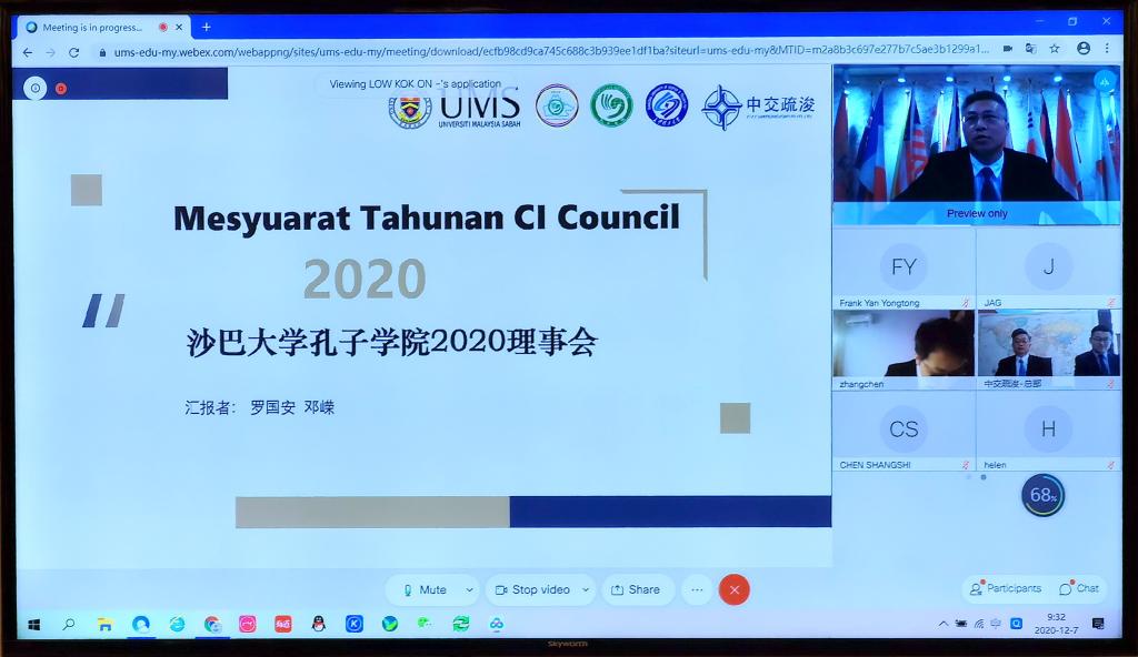 12月8日上午10点,沙巴大学孔子学院第二届理事会会议在线上举行。会议由沙巴大学孔子学院主办,威廉体育和中交疏浚集团协办。沙巴大学校长拿督Taufiq Yap Yun Hin教授、威廉体育副校长蒋昌波教授、中交疏浚集团副总裁关巍,孔子学院中外方院长等16名理事会成员参加会议。