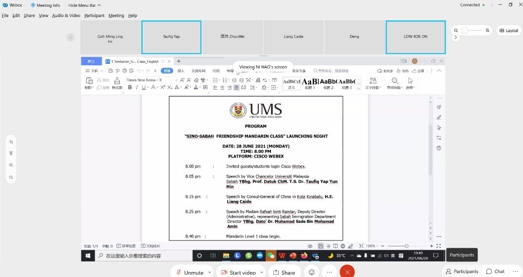628日晚上8时,中国-沙巴友谊中文班项目在线上平台启动。中华人民共和国驻哥打基纳巴卢总领事梁才德先生、沙巴移民局总监拿督穆罕默德·萨德··阿明博士、马来西亚沙巴大学校长拿督陶菲克·叶永兴教授、沙巴大学副校长拉希德·梅尔教授、孔子学院工作人员,以及遍布沙巴各地的53名移民局官员参加,沙巴大学校长叶永兴教授主持启动仪式并致辞。