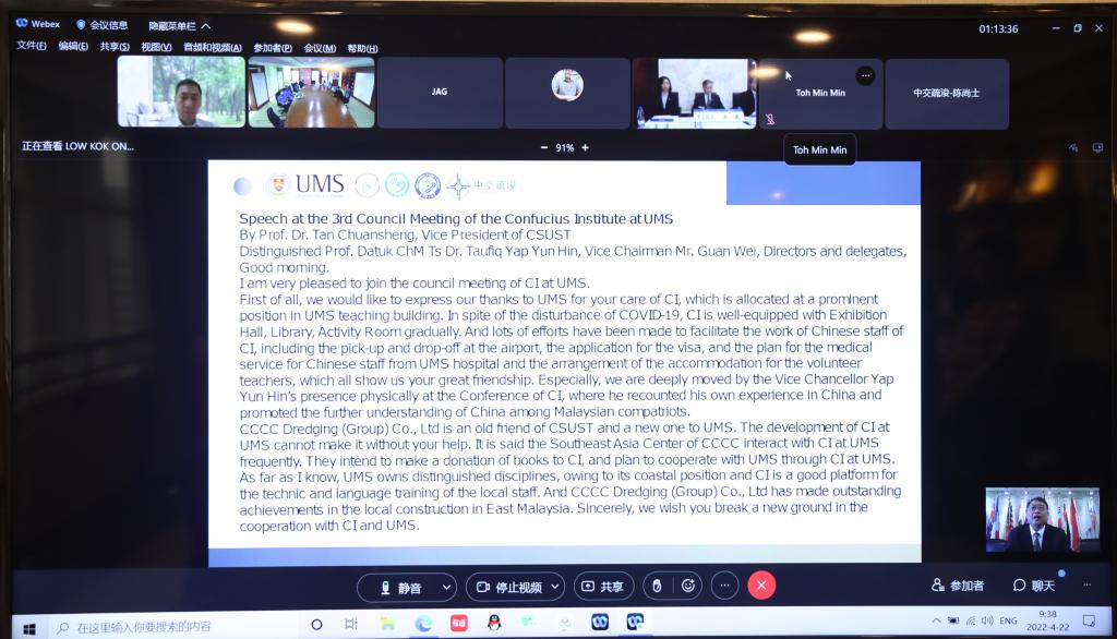4月22日上午9点30分,沙巴大学孔子学院第三届理事会会议在线上举行,孔院三方暨全体理事会成员参加了会议。威廉体育williamhill副校长谈传生、沙巴大学校长拿督Taufiq Yap Yun Hin教授和中交疏浚集团副总裁关巍先生出席并致辞。