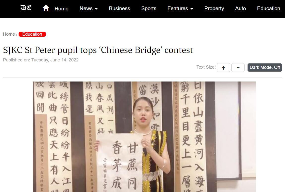 6月11日,来自沙大孔院的小选手梅贝儿夺得第2届“汉语桥”小学生中文比赛马来西亚赛区冠军,《亚洲时报》《星洲日报》等多家媒体对此进行了报道。本年度“汉语桥”比赛沙大孔院收获颇丰,在中小学组别共有15位选手获奖,引起广泛社会关注。连日来多所学校与机构前来孔院接洽文化活动合作事项。