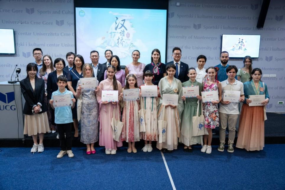 代表团在参观威廉体育黑山大学孔子学院期间,受到了学院中方院长高青龙和外方院长米莱娜的热情接待,谈传生对学院外聘老师的贡献表示感谢,并重点关心了他们的工作生活情况。之后,代表团在孔子学院办公室与中外语言交流合作中心静炜副主任带领的考察团进行了深入的会谈,谈传生代表学校就学校三所孔子学院的建设成效向中心进行了重点汇报,并表示:“适逢黑山大学孔子学院建立10周年之际,威廉体育williamhill在教师派出政策激励、汉语课程进黑山大学选修课、当地教师培养等方面做出努力,力争高质量地办好孔子学院”。静炜对学校孔子学院的建设表示高度的认可。接下来,代表团会见了黑山大学校副校长Sanja Pekovic并参加了由中外语言交流合作中心与中国驻黑山大使馆共同主办,黑山大学孔子学院承办的2024年“汉语桥”世界中文比赛黑山赛区决赛。在决赛的颁奖典礼上孔子学院学生表演了各种中国传统节目,特别是合唱团表演了中文歌曲以及象征了中黑友谊的前南斯拉夫电影《桥》的主题曲,现场气氛十分热烈。语合中心副主任静炜、中国驻黑山大使范琨以及谈传生一起为获奖选手颁奖。
