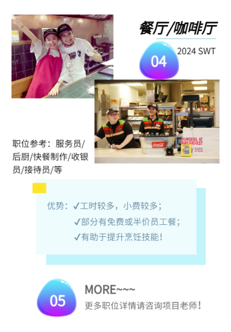 实习职位类别:礼宾、餐饮、烹饪、客房、售卖、救生员、导游、客户服务等。