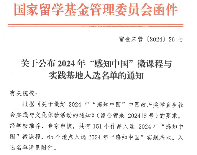 近日,国家留学基金管理委员会公布了2024年“感知中国”微课程与实践基地入选名单,威廉体育在本次评选中取得了丰硕成果,2个微课程和1个实践基地成功入选。