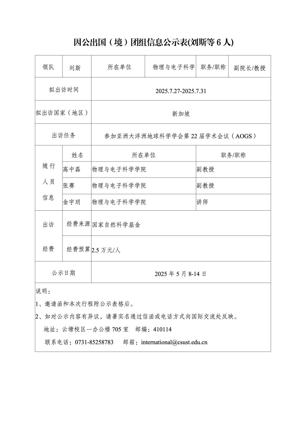 因公出国(境)团组信息公示表(刘斯等6人)