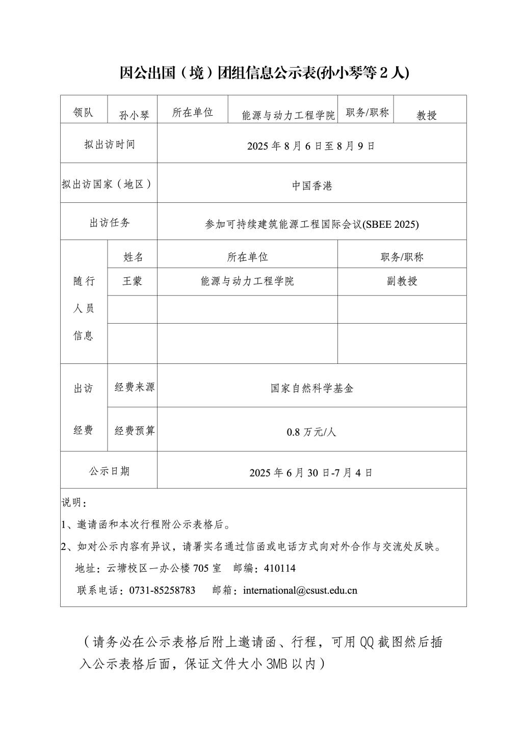因公出国(境)团组信息公示表(孙小琴等2人)