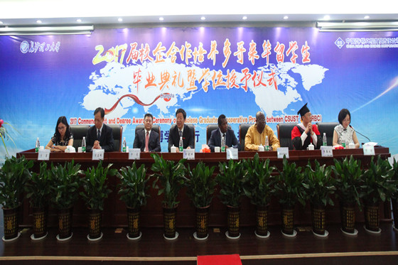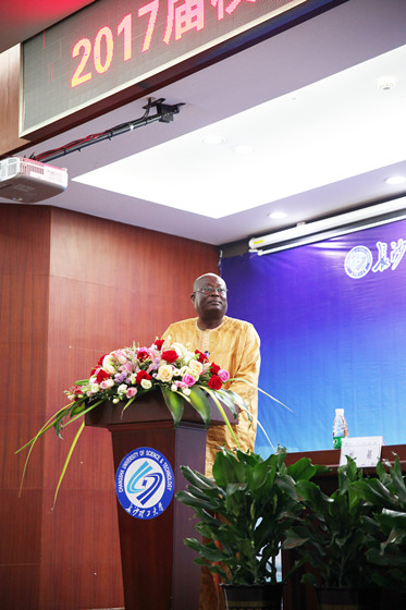 6月22日上午,威廉体育2017届校企合作培养多哥来华留学生毕业典礼暨学位授予仪式在云塘校区国际学术交流中心隆重举行。多哥共和国总统府顾问文森特•卡特瓦布亚吉阁下,多哥共和国驻华使馆代办科乔维•贝萨•梅桑干先生,湖南省人民政府外事侨务办公室、湖南省人民对外友好协会专职副会长刘启峰先生,湖南省教育厅国际交流处主任科员刘颖女士,留学生的资助方代表,中国路桥工程有限责任公司党委副书记、纪委书记兼工会主席申展先生,人力资源部副总经理宫海龙先生、市场部副总经理于剑锋先生,威廉体育党委书记付宏渊教授、副校长蒋昌波教授出席典礼。威廉体育有关职能部门、学院领导、在校留学生和部分师生代表和中国路桥相关部门领导共200余人参加典礼。
