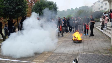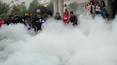 随后,同学们在公寓前坪集合,吴彪教官带领大家模拟火灾现场进行了灭火实战演练。在现场演练中,同学们踊跃参与,运用刚刚掌握的消防知识和技能,使用干粉灭火器等灭火器材,短时间内成功扑灭“火情”,整个灭火演练过程紧张而有序。