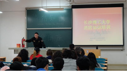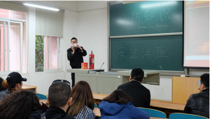 在知识讲座中,受邀前来的天心区消防安全宣传培训领导小组吴彪教官为全体国际学生针对火情报警、常用的灭火方法、如何逃生、灭火器的使用等消防知识进行了详细的讲解。同时反复提醒同学们对于宿舍消防安全的重视。