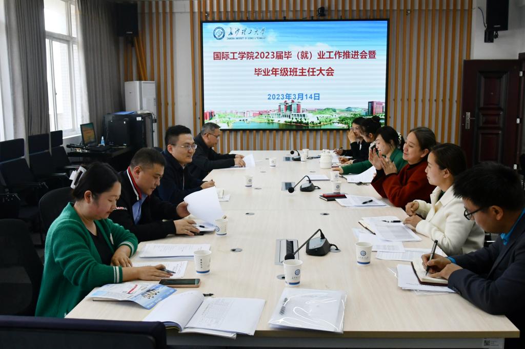 3月14日下午,国际工学院在新能源大楼1栋416会议室召开2023届毕(就)业工作推进会暨毕业年级班主任大会。院党总支书记王学成,副书记兼副院长乔法光,学工办、教务办以及2023届毕业生班主任参加会议。