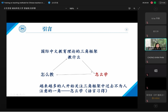 湖南师范大学曾丽娟教授进行了本次培训的第一次授课,题目为:从“怎么学”到“怎么教”——汉语二语习得与汉语二语教学。曾教授从理论与实践两方面入手,结合案例对汉语作为第二语言的学习与教学做了简要而系统的介绍,内容精彩、生动有趣。