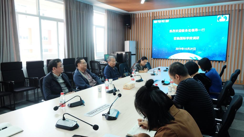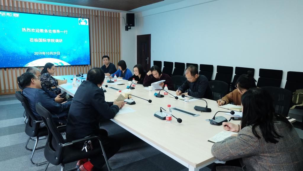 1029日下午,教务处处长刘朝晖,副处长贺跃光、刘思强,教学运行管理办公室主任郭利一行到国际学院考察、调研,校党委委员兼国际学院党总支书记付嫦娥、院长陈瑜等陪同。