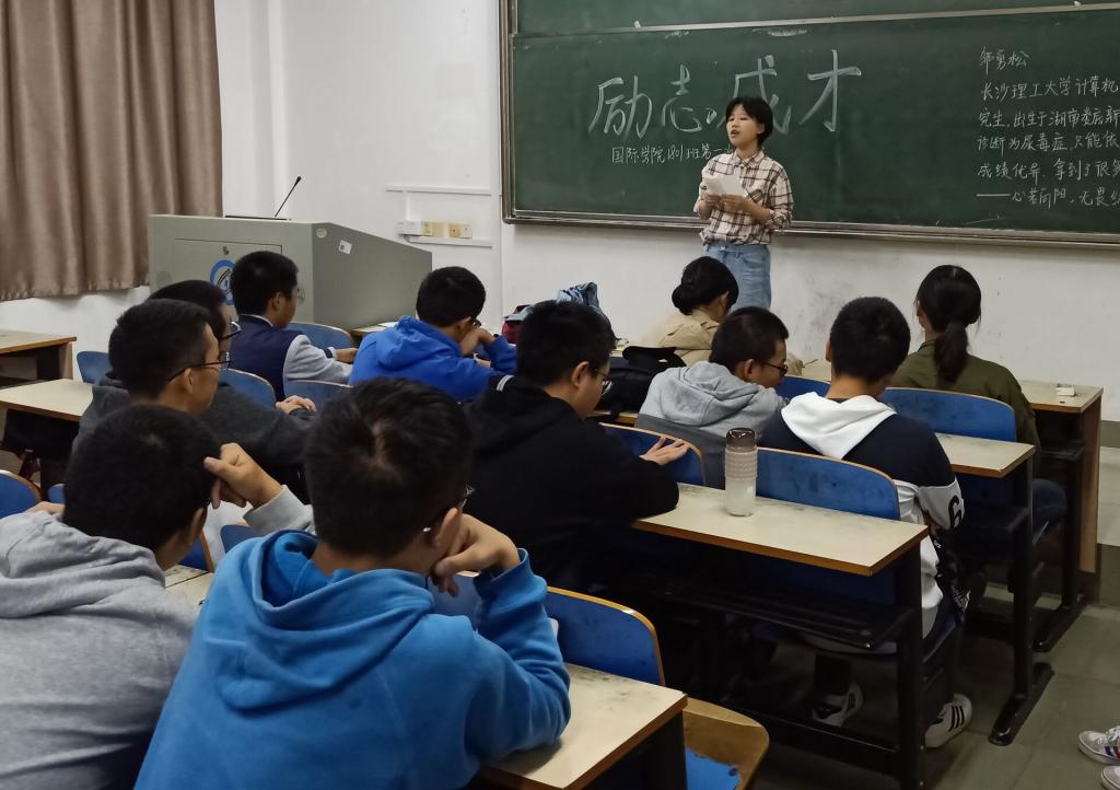 为进一步弘扬社会主义核心价值观,教育和引导18级新生坚定理想信念,争做担当民族复兴大任的时代新人,10月16日晚,国际学院组织2018级新生在金盆岭校区6教206、207、209教室成功召开了“心若向阳,无畏绽放——学习邹勇松同学先进事迹”的主题班会。