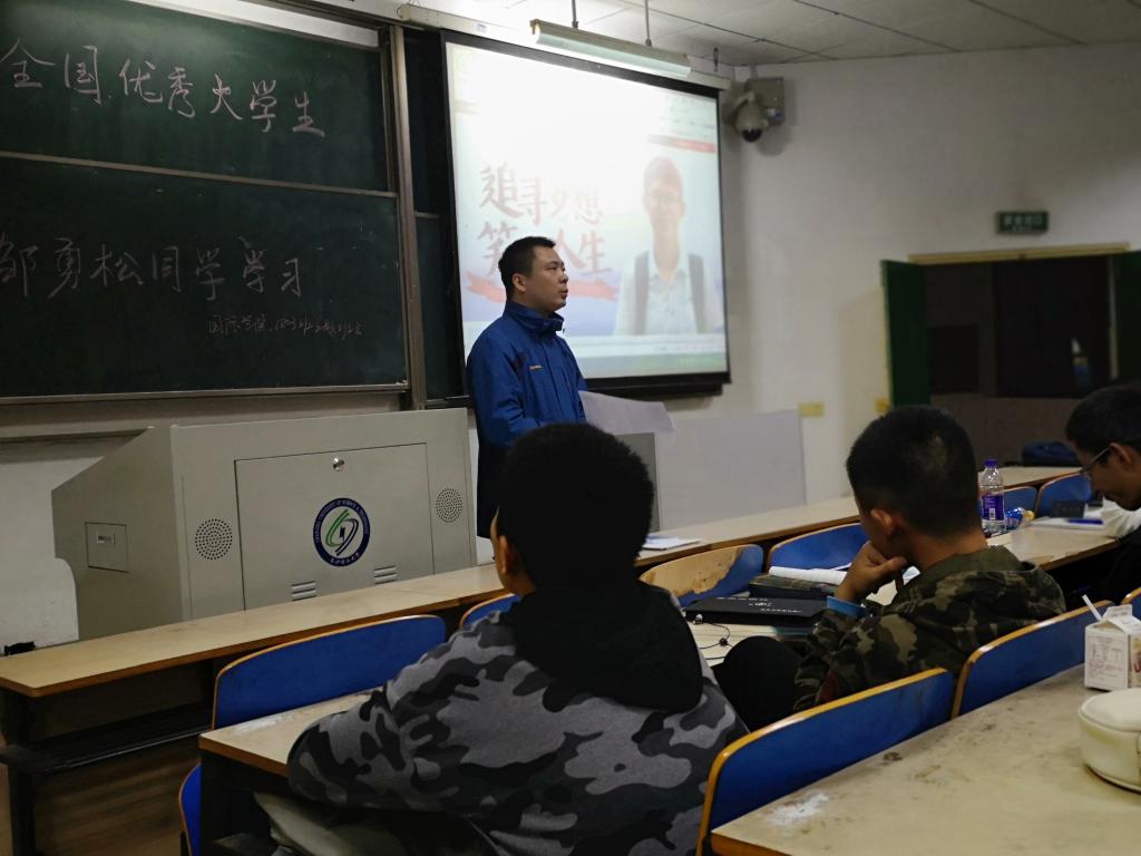 首先由吴振华和唐宏敏两位老师带领大家学习了教育部《关于授予邹勇松同学“全国优秀大学生”荣誉称号的决定》、高校思政工作简报[2018]第48期刊登的文章《“优秀大学生”邹勇松模范践行社会主义核心价值观 努力做担当民族复兴大任的时代新人》及学校党委《关于向邹勇松同学学习的决定》的文件,并组织同学们观看了邹勇松同学先进事迹宣传短片《世界以痛吻我,我要报之以歌》,使同学们对邹勇松同学的先进事迹有了全面的了解和认识。