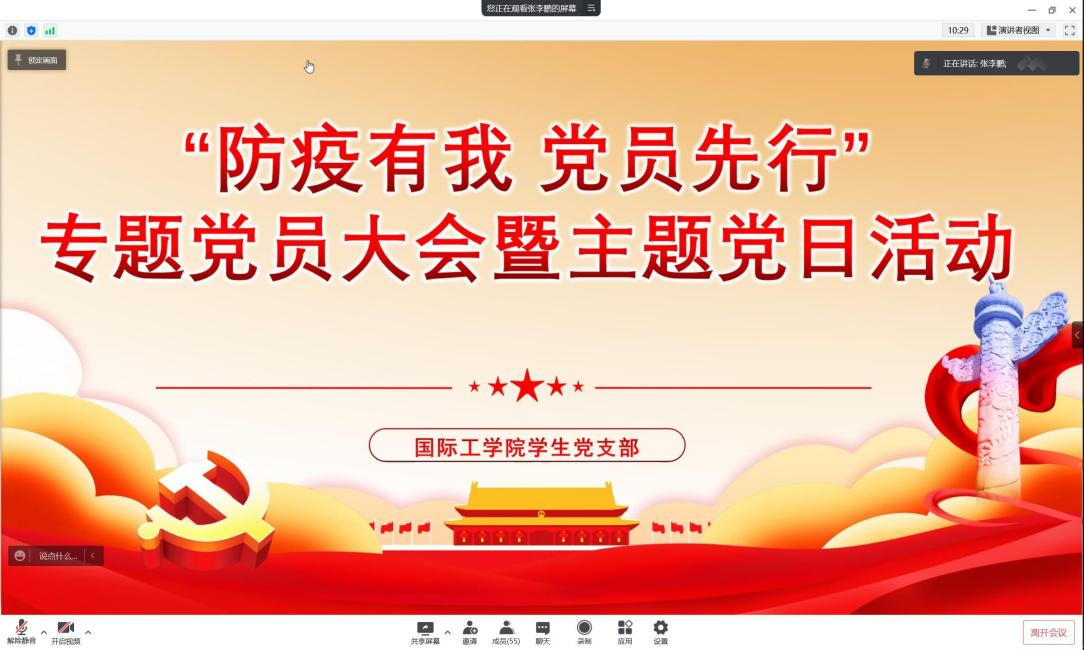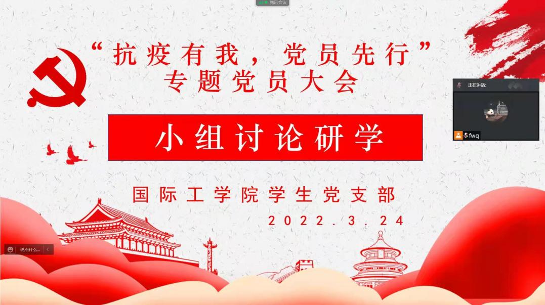 3月24日晚,国际工学院学生党支部通过腾讯会议平台线上召开了“抗疫有我 党员先行”线上专题党员大会。本次会议旨在传达学习两会精神,凝聚党员先锋力量,安排部署疫情防控工作。会议由宣传组组长张李鹏主持,国际工学院党总支副书记兼副院长乔法光,学工办全体老师和全体学生党员参会。