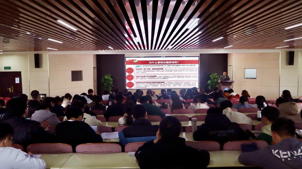 11月14日,党总支书记王学成在工科三号楼A307作题为《关于新形势下党内政治生活的若干准则》专题党课,国际工学院全体学生党员参加。