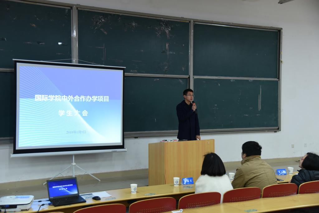 为加强中外合作办学项目学生对出国申请流程以及外方引进课程学习的了解,同时进一步加强国际学院学风建设,1月9日晚7点,国际学院在文科楼B300召开中外合作办学项目学生大会。国际学院院长陈瑜、党委副书记吴振华、副院长秦卫星,中外合作办学项目办公室全体老师以及中外合作办学项目全体学生参加了会议。会议由学生辅导员刘森峙主持。