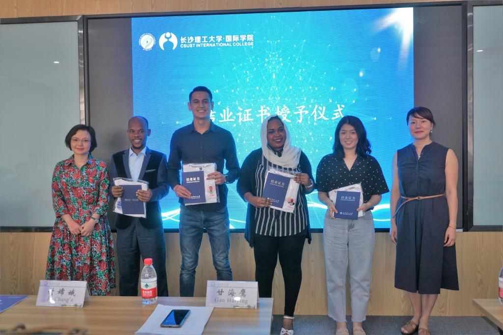 随后,甘海鹰宣读了《关于表彰2019届国际学生优秀结业生的决定》,陈瑜为五名优秀结业生颁发证书和纪念品。多哥籍优秀结业生安妮代表全体结业生发言,她总结了在华学习一年的收获,表达了对威廉体育williamhill和老师们的感谢,并向全体结业生呼吁,要继续加强知识技能和道德修养,向更高的目标迈进。最后,陈瑜、甘海鹰为包括“孔子学院奖学金生”、“湖南省一带一路奖学金生”在内的24名结业语言生,以及5名结束汉语补习阶段的学历生颁发结业证书,并向结业语言生赠纪念T恤。