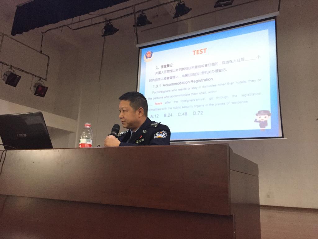 讲座上,陈军就《中华人民共和国出境入境管理法》、宗教管理和其他注意事项,从入境出境、居留、法律责任、驾车等方面,结合相关事例,为同学们进行了详细的说明、讲解和提醒,涉及到同学们在中国合法居留、合法生活、合法学习的方方面面。并要求留学生严格遵守我国的法律法规与学校的各项规章制度,做一位知法、懂法、守法的留学生。