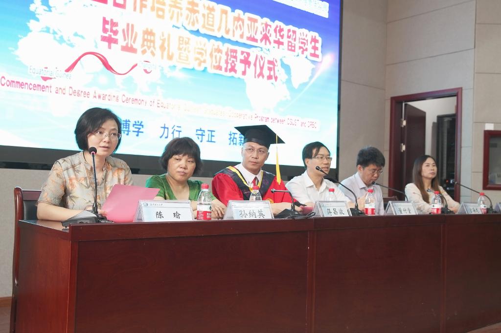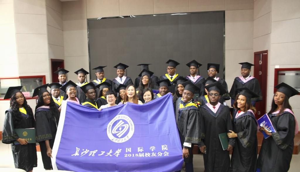7月12日上午,2018届赤道几内亚来华留学生毕业典礼暨学位授予仪式在云塘校区工二B区多功能厅隆重举行。副校长蒋昌波、校党委委员兼国际学院党委书记付嫦娥、国际交流处处长吴迪龙、校友中心副主任郑延恒、土木工程学院副院长陈伏彬、经济与管理学院副院长谢朝华,留学生资助方中国路桥工程有限责任公司董事、总会计师董付堂、人力资源部副总经理宫海龙、人力资源部许囡,国际化人才培养实习基地湖南路桥建设集团有限责任公司工会主席孙纳英、人力资源部副部长陈新伟出席。参加典礼的还有国际学院国际学生工作办公室全体老师、2018届赤道几内亚毕业生的亲朋好友以及黑山孔子学院到威廉体育参加夏令营的全体营员等。毕业典礼由国际学院院长陈瑜主持。