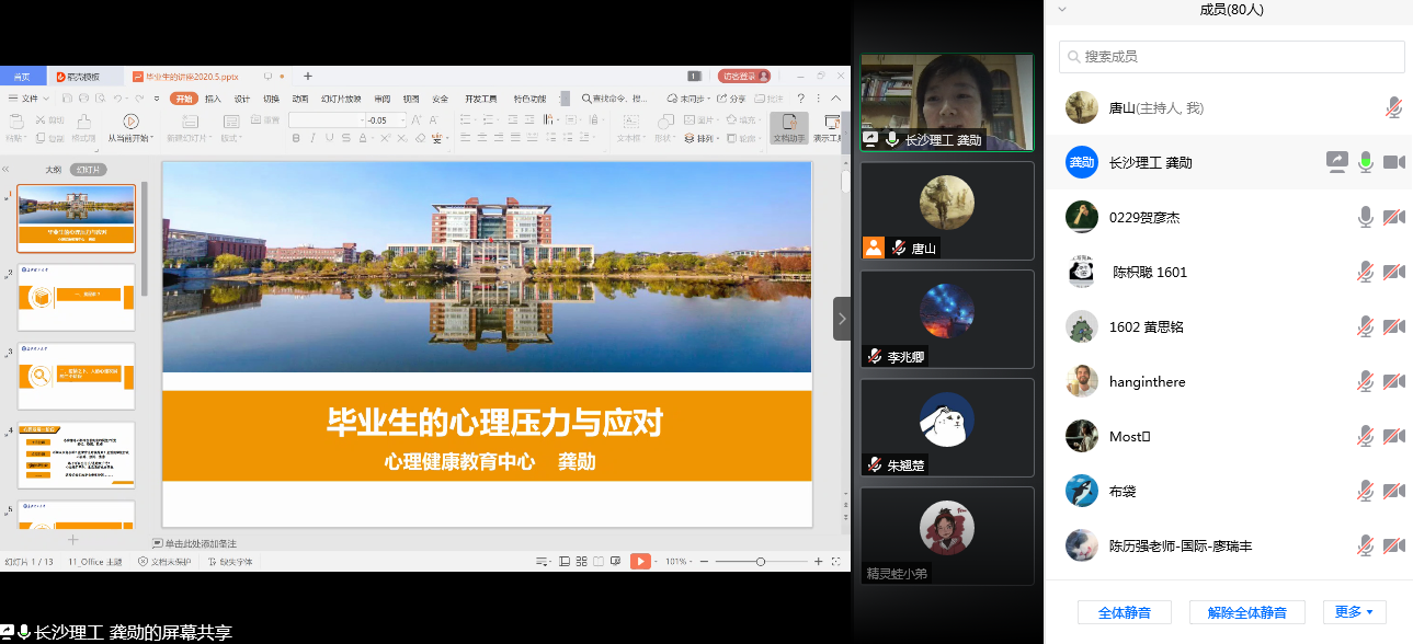 龚勋主任分析了毕业生所面临的心理压力,并指导学生应当采用的应对方案。首先,龚勋主任分析了此次疫情可能会给我们带来的影响,并指出了疫情之下,人们心理发展的三个阶段。在此基础上,龚勋主任继续分析了后疫情阶段,毕业生的心理状况,并提出了解决方案。其次,对于毕业年级学生所面临的各种客观问题与压力:例如,就业、考研等,大家应该改变态度、学会求助,与同学和老师一起分析自身压力。随后,对于那些难以解决的问题与压力,同学们可以找专业人士进行开通疏导,并留下了“湖南省高校疫情心理援助平台”以及“威廉体育williamhill线上心理服务平台”的联系方式,给有需要的学生提供帮助。最后,龚勋主任指出,面对生活中的各种变化,我们一定要积极地调整自己的心态,聚焦于当下我们能够做到的事,对自己不要有过度的要求,这样我们才能够调整好自己的心理与情绪,平稳度过这个特殊的毕业季。