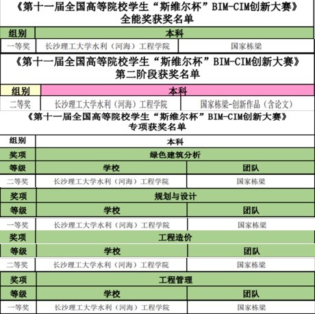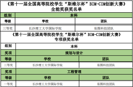 经过激烈角逐,国际学院中外合作办学(土木工程专业)2017级、2018级的易树德、丁山、易明威、龙鑫洋、肖翼邦等学生负责、参与的四支队伍,分别在土木学院付果、刘建生等多位老师的指导下,荣获全能项全国一等奖两项、二等奖一项、三等奖一项,工程管理专项全国一等奖三项、二等奖一项,绿色建筑专项全国一等奖一项、全国二等奖两项,规划与设计专项全国三等奖三项,毕业设计(含论文)全国二等奖一项、三等奖一项。这是我院在全国高等院校学生“斯维尔杯” BIM-CIM 创新大赛赛场上的一次重要突破。