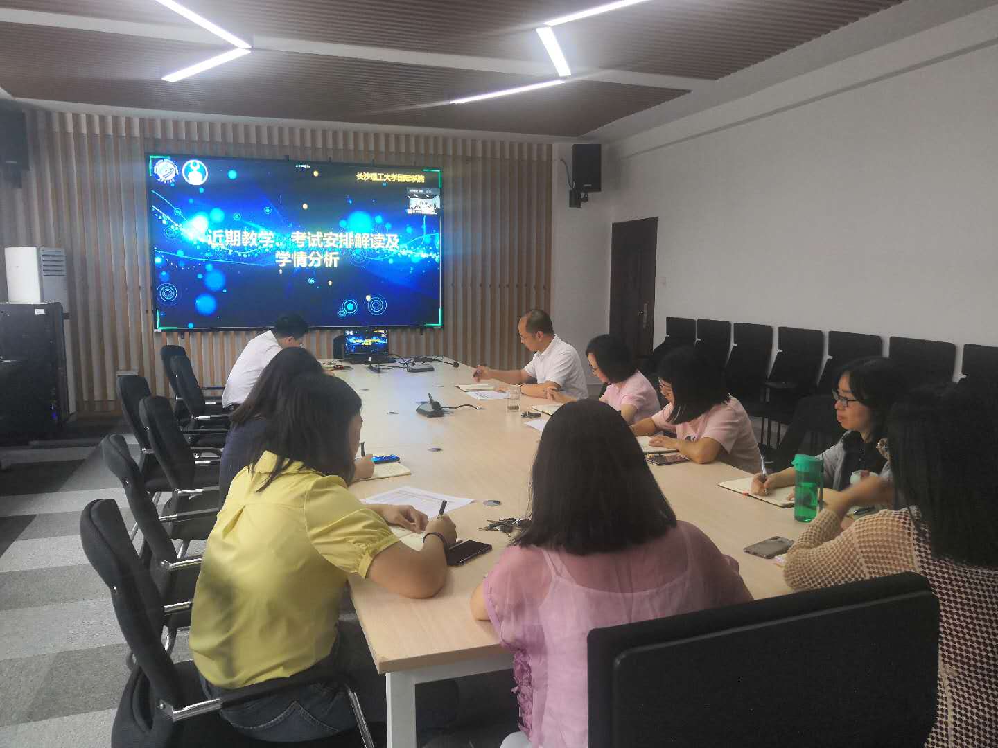 首先,副院长秦卫星就近期教学,考试安排进行了详细解读并对2017级学生入学以来的学习情况做出了具体分析。由于疫情影响,学院教学工作受到了巨大冲击,但经过同学、家长及老师们的一致努力,学院教学任务已按照湖南省教育厅的各项工作要求有序进行。随后,张锐副书记和唐宏敏老师分别对考研与就业进行了指导。希望同学们尽早准备,尽早规划,尽早明确目标,做好相应准备,并为之努力奋斗。紧接着,张锐从疫情防控、人身安全、交通安全、财产安全等多方面对同学们进行了安全教育,并告诫同学们不要下河下水库等危险地带游泳。陈瑜院长进行了重要讲话,并对所有同学们提出了三点要求:我们要以大局为重、坚若磐石;以学业为重、高度自律;以未来为重、责任在肩。