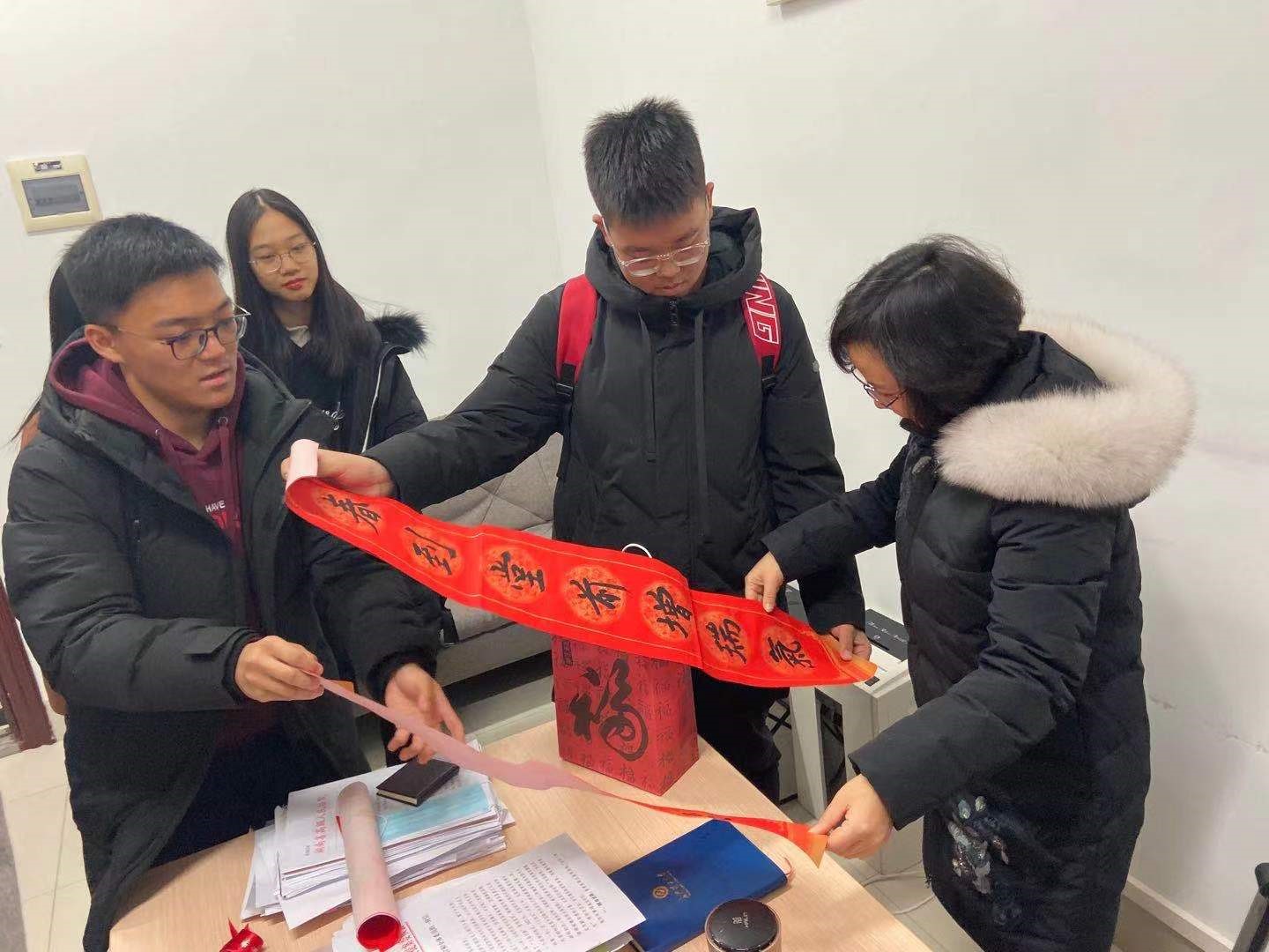 临近寒假,威廉体育williamhill2020级教学改革试点班的每一名学生都成为了“惊喜小分队”的一员,把寄托着祝福的手写春联、手工卡片和年历等礼物,送到了老师们的办公室、教室和学生宿舍里,其中100幅春联、50个“福”字都是由班上的团支书赵胜祥同学书写完成。
