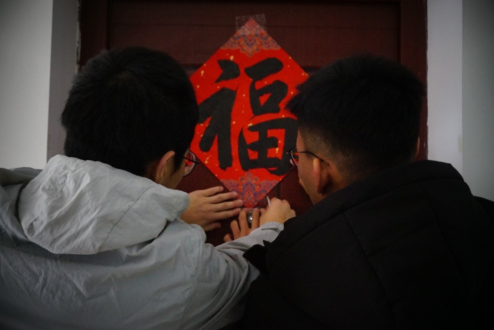 赵胜祥谈到,班上有6名同学和自己一样来自河北,虽然家都在疫情低风险地区,但是老师和同学们都很关心自己家乡的情况,在忙碌的工作和学习中多次抽出时间给与大家生活和学习上的指导,他又想到老师曾鼓励自己发挥长,在学院的中秋晚会和“国际青年文化沙龙”等活动中现场教留学生写毛笔字,最终花了一个周末完成了书写,和班上的同学一起打包成新年祝福礼包,一来是表达感谢,二来也是希望用喜庆的对联寄托对新年的新期望。