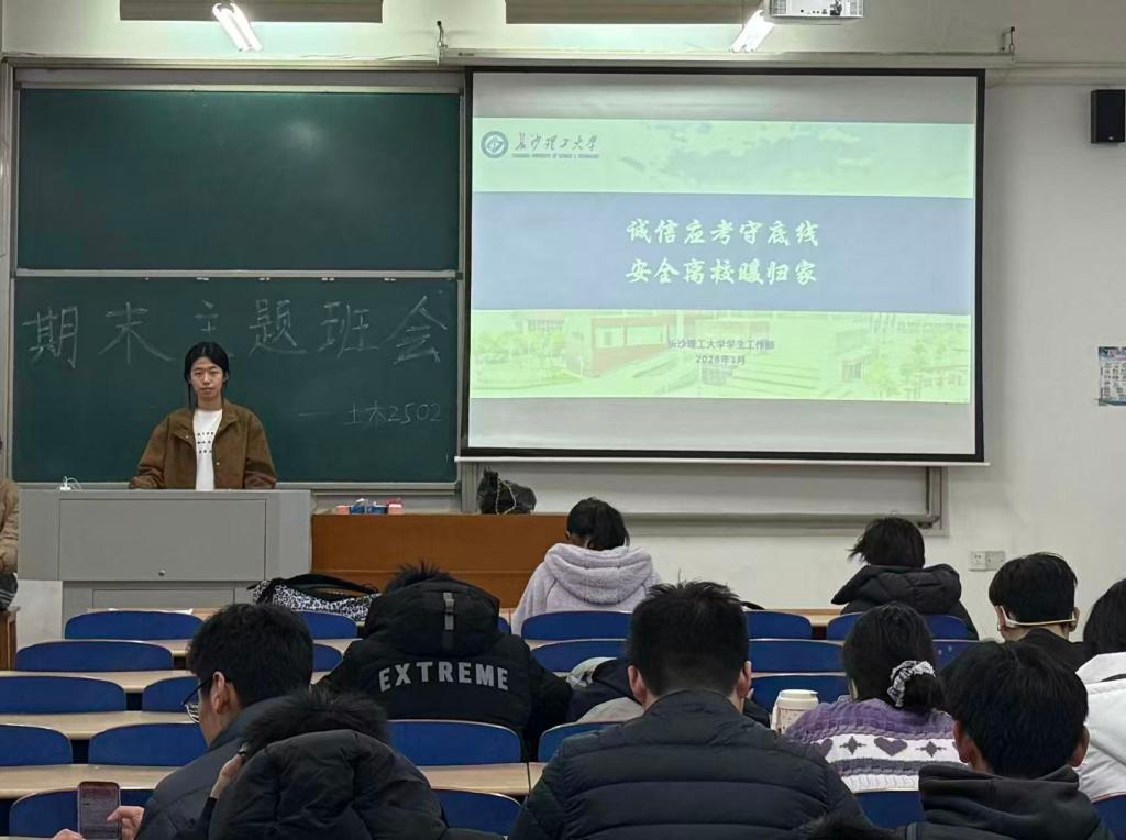本次班会的核心内容为考风考纪和诚信应考教育、期末安全教育、期末人文关怀与精准帮扶共三个方面。各班级组织学生系统地学习了《威廉体育williamhill学生考试违规处理办法》等文件,结合典型案例剖析违规后果并以班级为单位完成了《诚信考试承诺书》签署;围绕消防、反诈、校园交通等安全要点,通过视频学习、案例讲解开展专题教育,明确离校报备流程与返乡安全要求;同时班长针对学业压力、经济困难等问题讲解了心理健康支持渠道与特困补助申请方式。