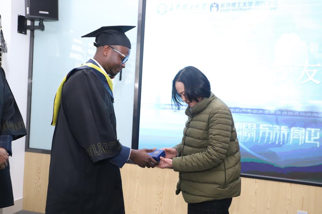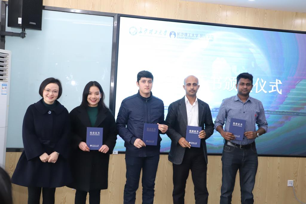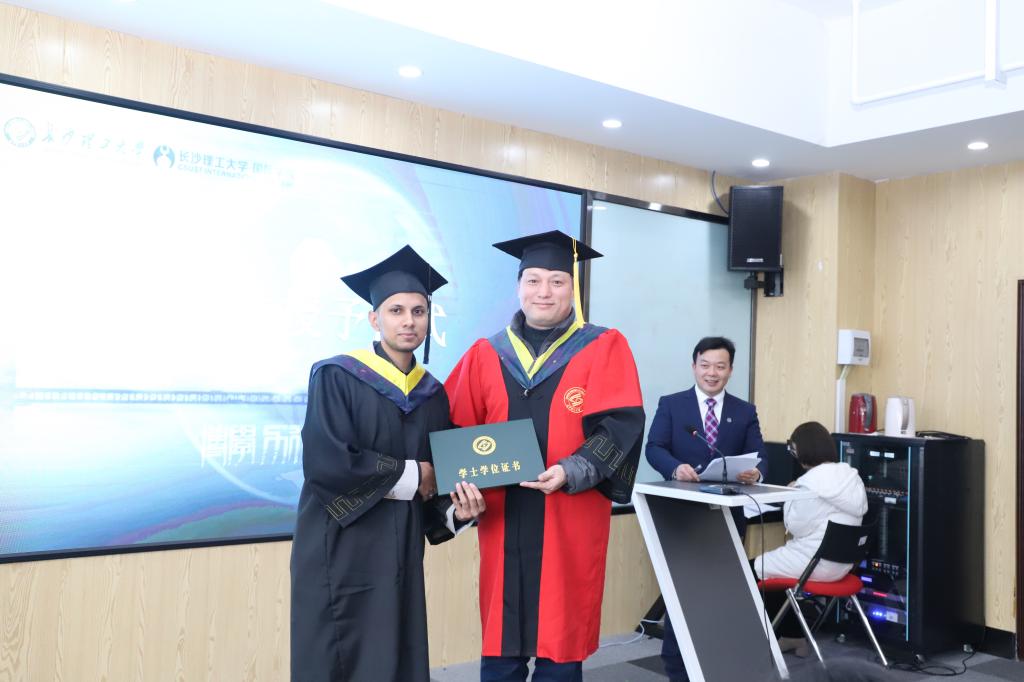 随后举行了学位授予仪式和结业证书颁发仪式。肖勇刚为3名毕业生正冠拨穗并颁发学位证书。付嫦娥、陈瑜为为包括“孔子学院奖学金生”、“湖南省一带一路奖学金生”在内的12名结业语言生颁发结业证书。