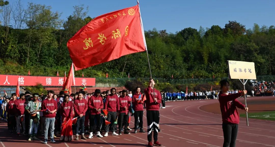 在运动会开幕式上,国际学院方阵的成员手中挥舞着各国旗帜,迈着整齐的步伐,昂扬的走向主席台。留学生们身着民族服装展示了热情洋溢的非洲鼓表演,中国学生的舞蹈散发着朝气蓬勃的气息。他们精神饱满,充分展现了国际青年的风采。