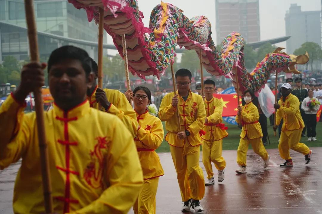 主席台前,伴随着铿锵有力的鼓点,留学生与中国学生一起进行了舞龙和武术表演。金色长龙翻腾起舞,南拳北腿虎虎生威,引来观众们的阵阵喝彩。国际学子借舞龙、武术展示中华传统文化和体育精神,展现国际健儿们朝气蓬勃携手并进的精神面貌。