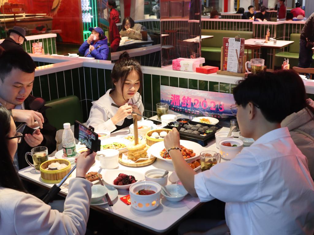 景点游览完毕后,大家来到了“小吃王国”进行美食品尝直播,线上线下一起看菜单、点菜肴。“臭豆腐!”“糖油粑粑!”“毛氏红烧肉!”线上学员争先恐后地喊出了两天前课上学到的美食名称。不一会儿,菜上齐了,留学生们纷纷化身为吃播主持,向大家展示长沙代表性美食的色、香、味。线上学员隔着屏幕大呼“看起来太好吃啦!”“我也想飞去长沙吃美食!”最后,直播活动在大快朵颐的欢乐中结束。