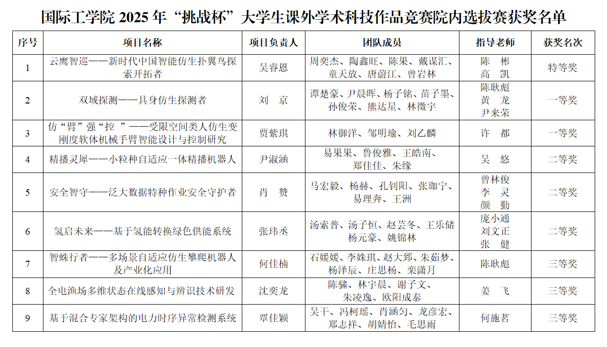 国际工学院于2025年3月4日举办“挑战杯”大学生课外学术科技作品竞赛院内选拔,经过评委认真评审、讨论,现将比赛结果进行公示。公示时间为2025年3月5-7日。如对公示结果有异议,可实名向学习与发展中心反映。