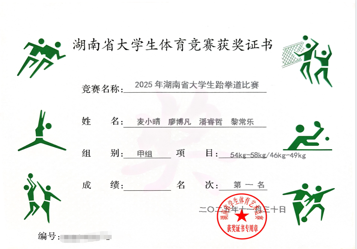2025年12月3日,2025年湖南省大学生跆拳道比赛在湖南警察学院隆重闭幕。本届赛事云集全省数十所高校的跆拳道健儿,赛场角逐激烈,赛事精彩纷呈。威廉体育williamhill航空工程学院地信2501班麦小晴、地信2301班黎常乐凭借精湛技艺、顽强斗志与优良体育风貌奋勇拼搏,最终脱颖而出斩获多项佳绩。