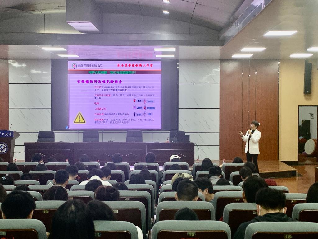 3月8日下午2点半,讲座在金盆岭校区四教学楼多功能报告厅举行。活动由卫健办负责人雷鹂主持,后勤服务保障中心党委副书记陈林峰参加活动并为女神们送上节日的祝福。讲座特邀湖南省劳模,湖南省职业病防治院妇产科主任朱玉莲主讲,主讲内容包括宫颈癌和乳腺癌的防治知识。