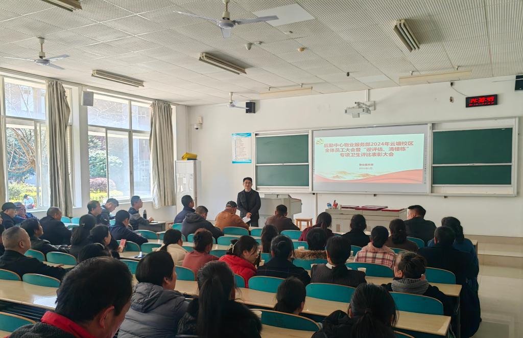 新学期、新气象。物业服务部于3月11日、12日分别在云塘校区综合教学楼A106教室、金盆岭校区12教100教室召开了全体员工大会暨专项卫生评比表彰大会。会议由后勤中心副主任李晓主持,物业全体员工200余人参加。