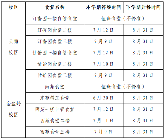 临近放假,学生陆续离校,就餐人数明显减少。在确保师生就餐前提下,学校各食堂停、开餐时间安排如下: