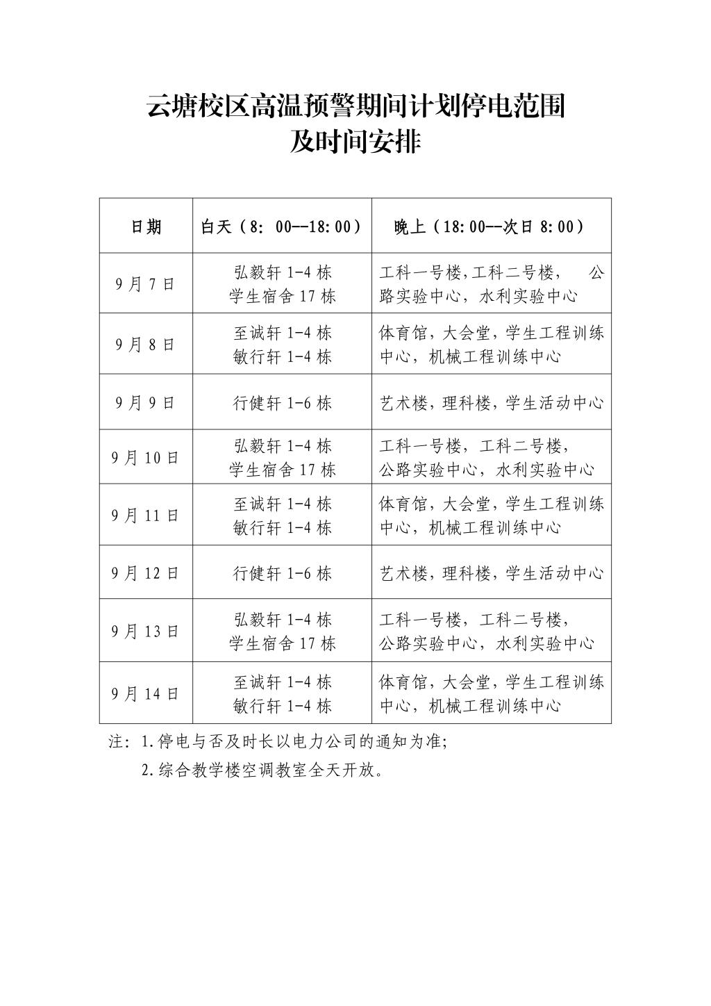 附件:云塘校区高温预警期间计划停电范围及时间安排