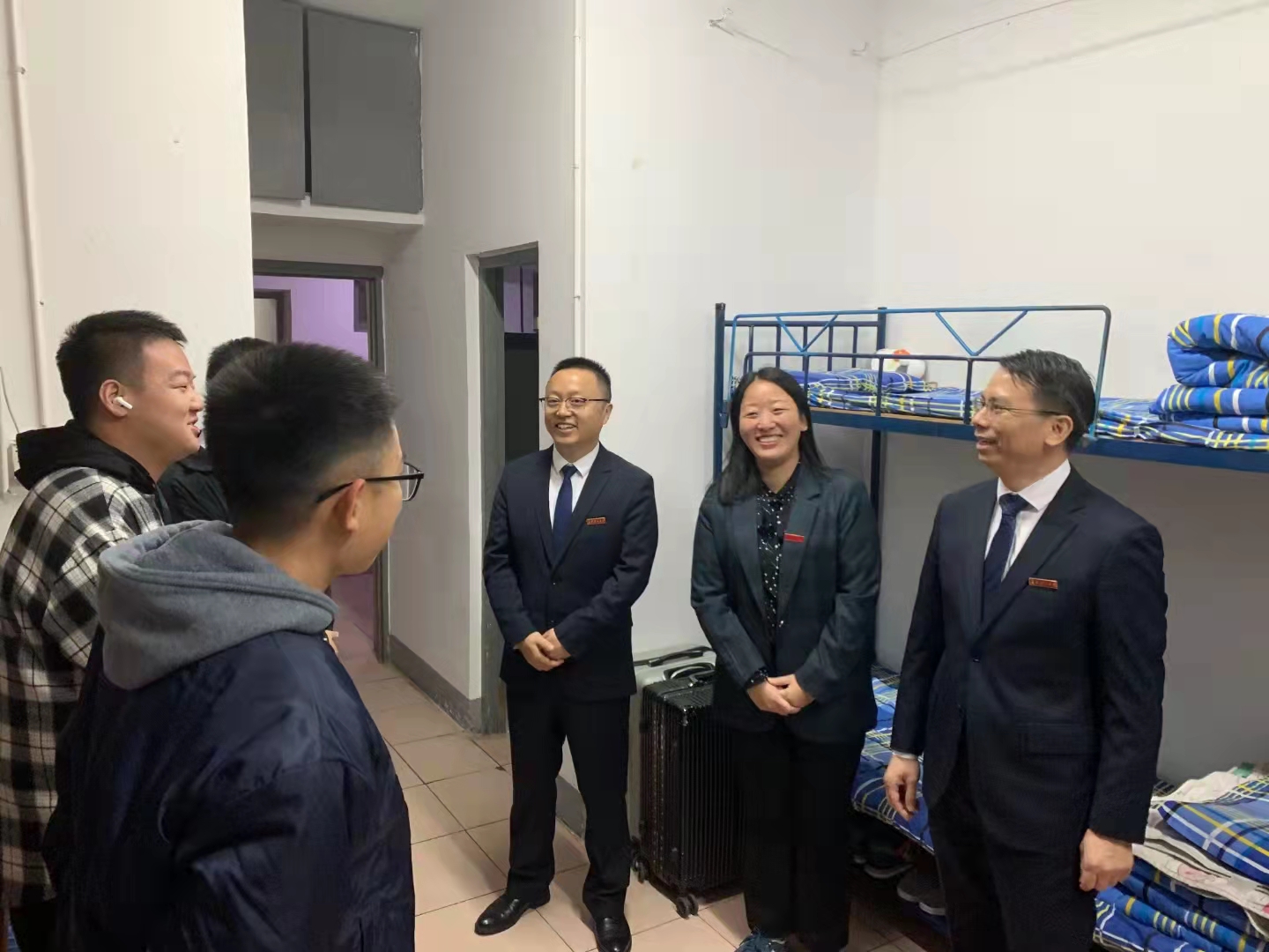 宋刘斌、陶双、张跃飞和张航来到金盆岭校区西苑4栋学生公寓,看望21级的本科男生。立冬之日,气温骤降,天气寒冷,领导们细心询问同学们是否准备好了棉衣棉被,并再三叮嘱同学们一定要做好防寒保暖,谨防发烧感冒。对于来自外省的同学,院领导们仔细地了解情况,关心他们来湖南后生活适不适应、饮食是否能接受,并亲切的告诉大家不要想家,这里就是大家的第二个家。同学们的宿舍干净整洁,充分体现出当代大学生的精神风貌,获得了领导们的一致点赞。