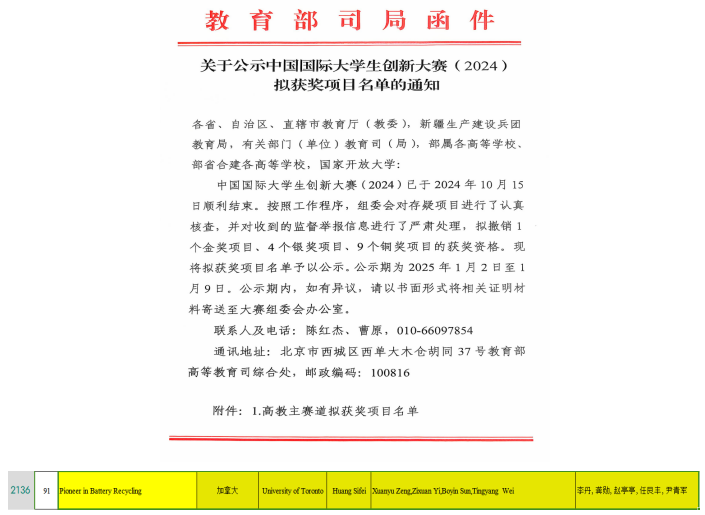 全国决赛两个阶段,我院李丹老师团队指导加拿大多伦多大学留学生的“Pioneer in Battery Recycling”项目进入国际项目的决赛,该项目融合了化学、材料科学、环境工程等多个学科的知识,并结合心理健康指导、新媒体传播策略及金融管理等领域的专业见解,实现了跨学科的创新合作;项目的实施不仅为解决废旧电池问题提供了新的思路,也为可持续发展做出了贡献。经过激烈的角逐,“Pioneer in Battery Recycling”项目喜获国赛银奖,为我院在学科竞赛A类赛事上的国奖实现了零的突破