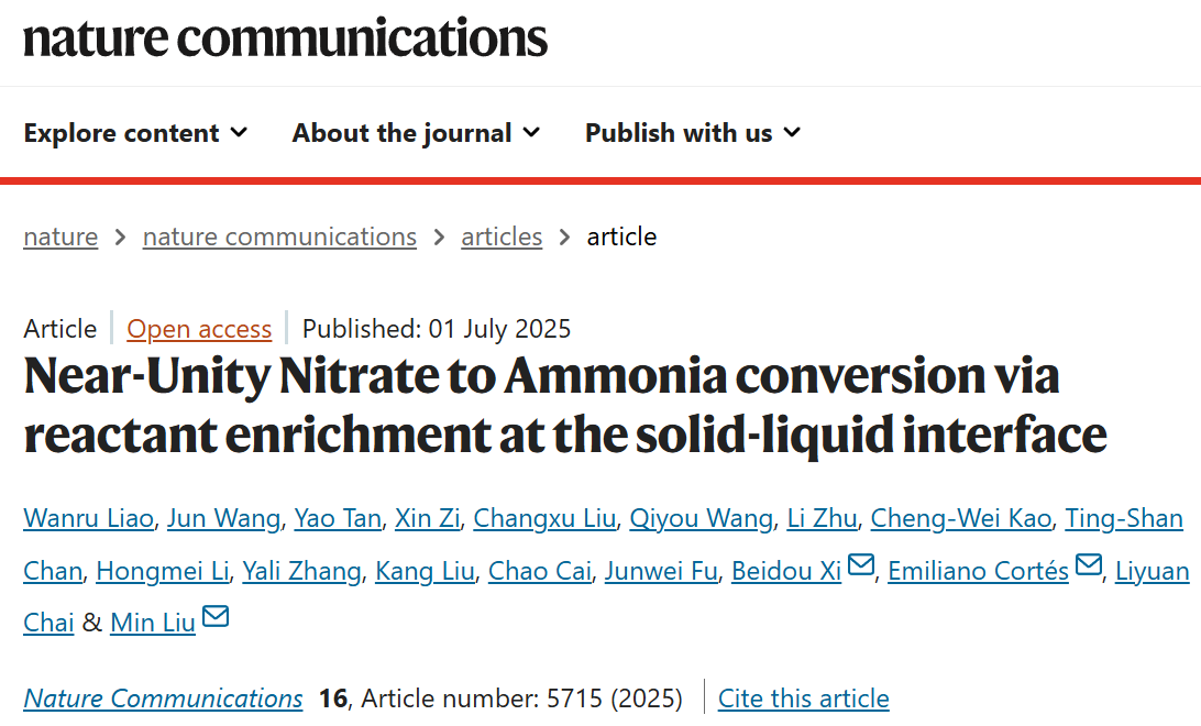 Liao W., Wang J. et al. Near-Unity Nitrate to Ammonia Conversion via Reactant Enrichment at the Solid-Liquid Interface. Nat. Commun. 2025, 16, 5715. https://www.nature.com/articles/s41467-025-60671-y.