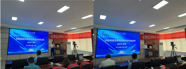 2023年5月24日上午,化学化工学院“化学化工类专业前沿系列名师专题课程”第三讲在工三A320会议室开展,特邀嘉宾为加拿大滑铁卢大学化学系教授、加拿大皇家学会青年院士刘珏文教授,讲座主题为“功能核酸及其在分析化学中的应用”。讲座由化学化工学院副院长(主持工作)张跃飞主持,副院长卿志和、学院教授委员会副主任朱志平、以及学院部分师生共计100余人参加了本次专题课。